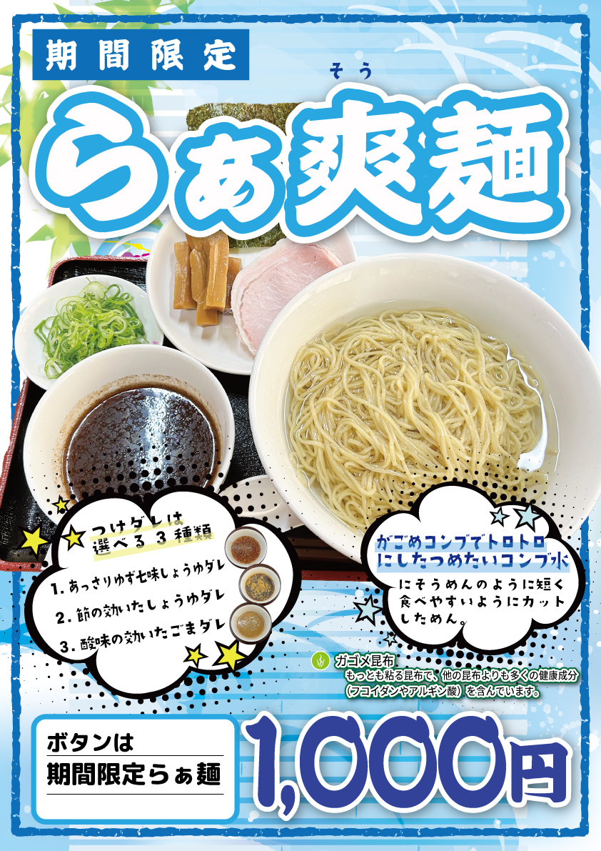 らぁ麺はち 期間限定「らぁ爽麺」ポスター。A3プリント+ラミネート加工