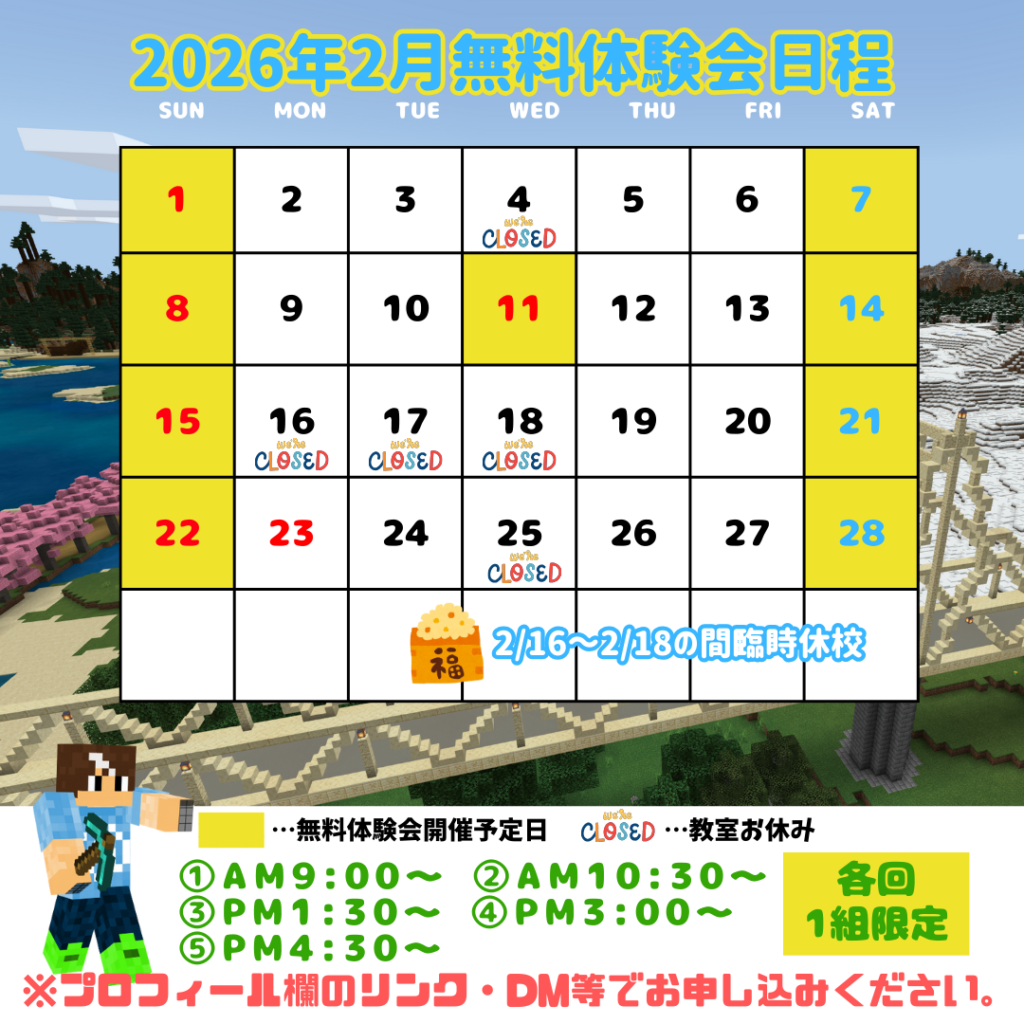 なお、2026/2/16~18まで臨時休校とさせていただきます。皆様にはご不便をおかけしますが何卒宜しくお願い致します。